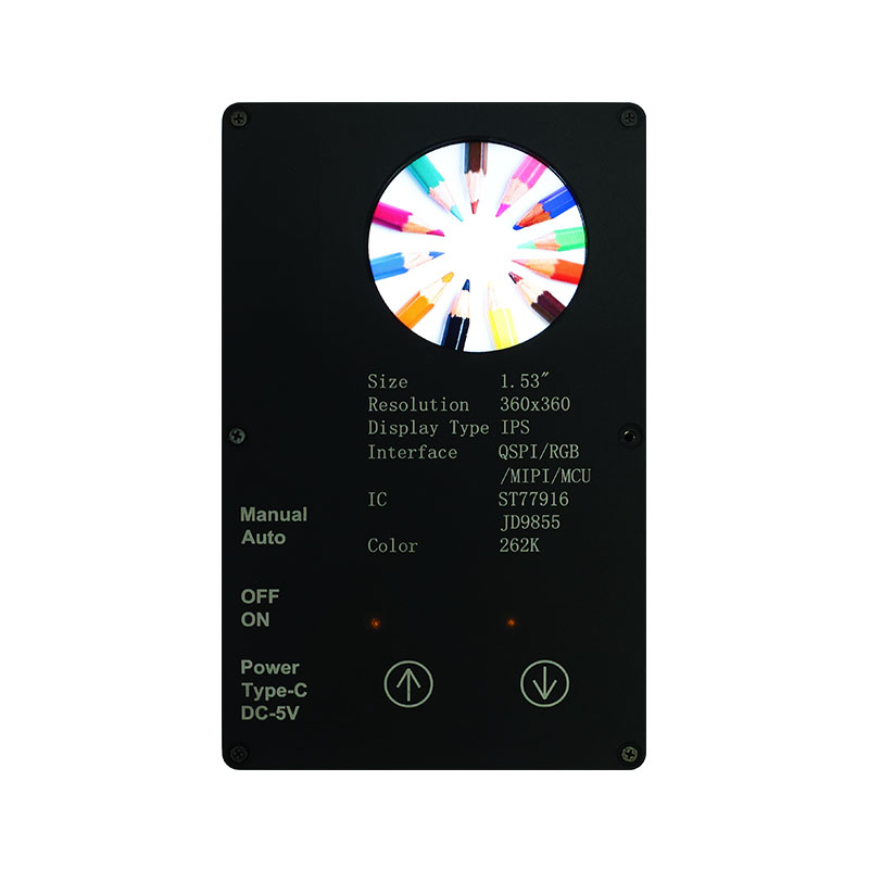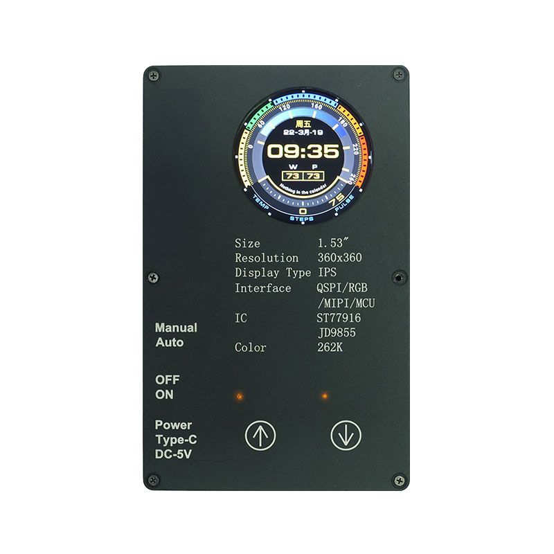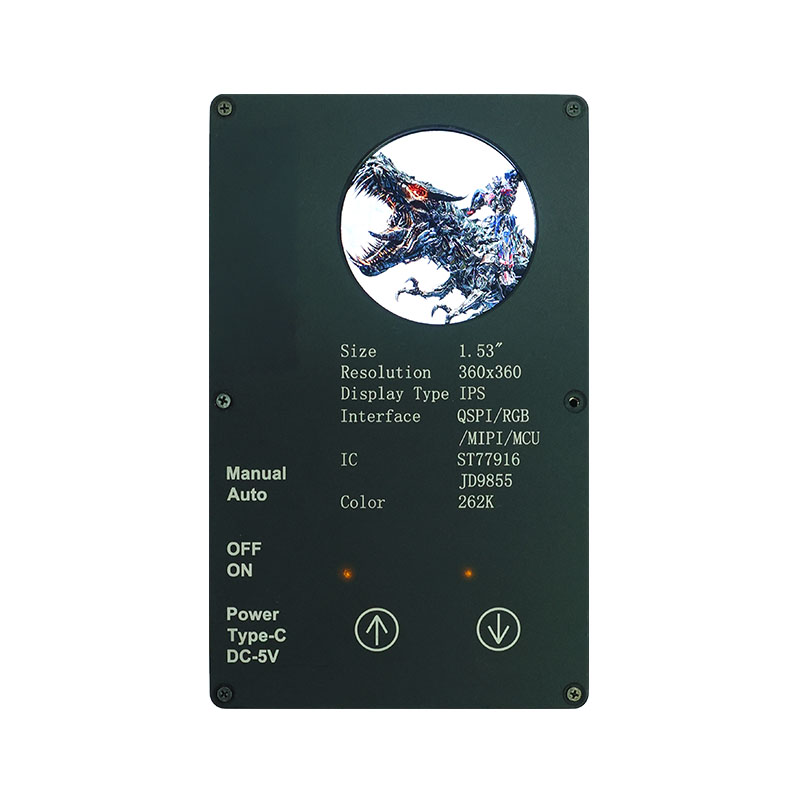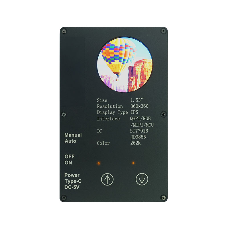 Ta zaslon po meri ima visoko ločljivost 360 × 360, vse kote gledanja in visoko svetlost 400 cd/m². Z industrijskim temperaturnim območjem delovanja (-20 ℃ ~ 70 ℃) zagotavlja jasno in stabilno delovanje v aplikacijah pametnega doma, kot so naprave za odstranjevanje pršic in sokovniki. Vmesnik QSPI in ST77916 Drive IC omogočata hiter prenos podatkov, njegova kompaktna velikost modula (40,46 × 41,96 × 2,16 mm) pa maksimira prostorsko učinkovitost.