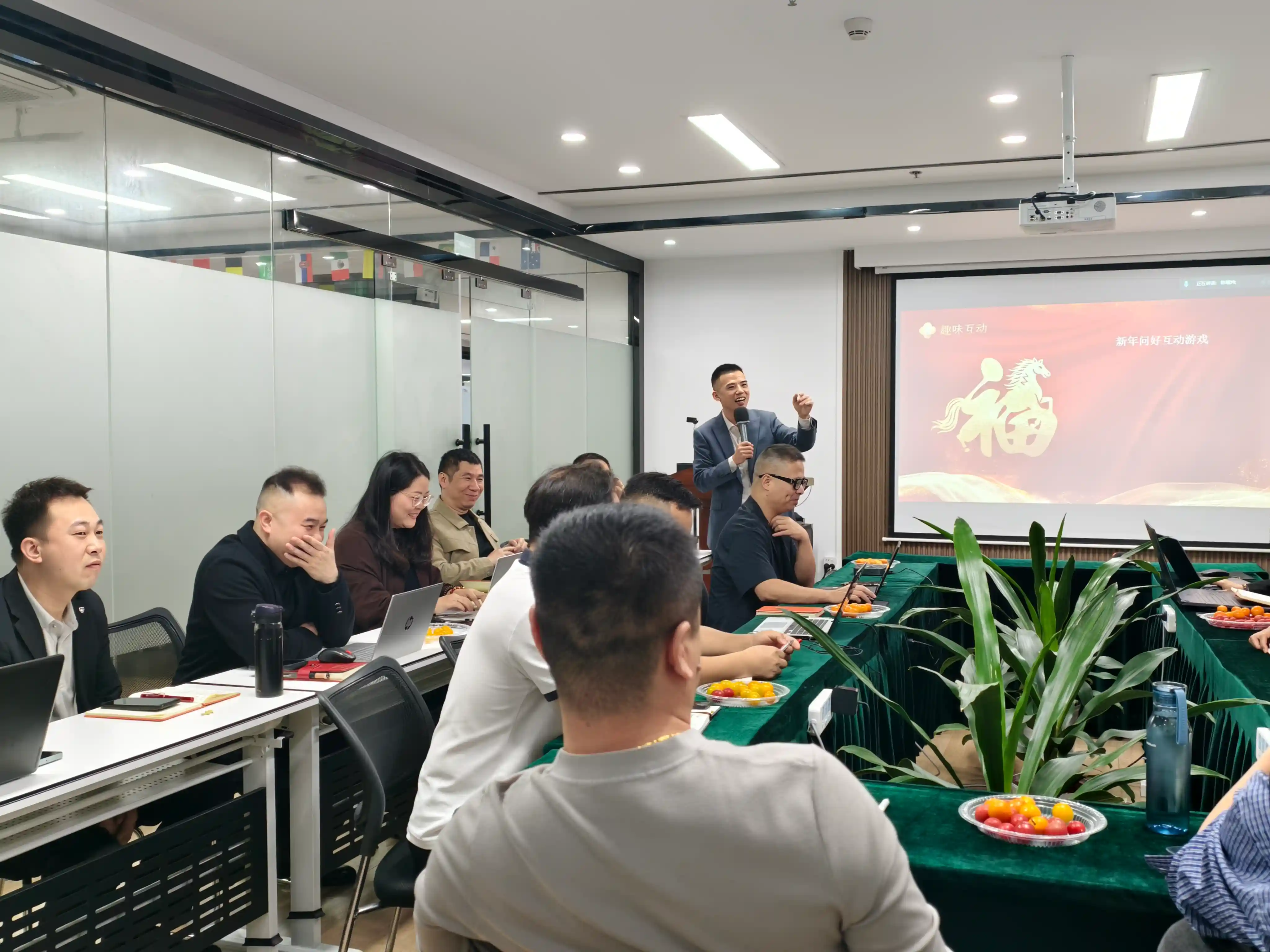 Prireditev se je začela z lahkotno in zabavno interaktivno igrico »Novoletne čestitke«. Kolegi so si izmenjevali blagoslove za leto konja, s smehom in veseljem premoščali razdalje ter podžigali prizorišče. Nasmejani obrazi in iskrene želje so se zlili v najtoplejši podton ekipe.